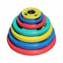 В комплекте: 7 пар цветных дисков весом 1.25, 2.5, 5, 10, 15, 20 и 25 кг (всего 14 блинов). Цвета: желтый, синий, красный, зеленый